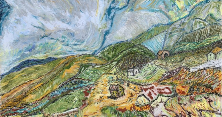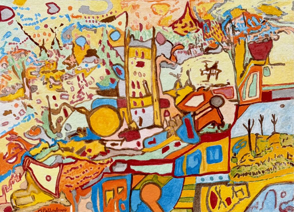 Boletus Edulis Oil Pastel, Drawn July 16, 2022 Size 12" x 16-3/4"Artist Michael J PalladinoBridge, Oil Painting Painted September 1, 1988 Size 14" x 16"Artist Michael J PalladinoPainters Pallet with Oil PaintSunflower Pastel Drawing, Drawn February 26, 2021 Size 12" x 18"Lake Annecy Encautic Wax Painting, Painted February 23, 2021 Size 9" x 13"World Hunger, Watercolor Painting, Painted June 13, 2022 Size 16" x 20"Scary Winds, Pastel Drawing, Pastel Drawing, Drawn September 8, 2022 Size 18" x 24"Pum Rum Pum Pum Pum, Oil Painting, December 30, 2022, Size 30" x 35"